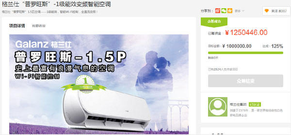 格兰仕“普罗旺斯”变频智能空调在苏宁易购众筹成功,达成率高达125%